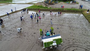 田植え機乗車体験もしました。歩きづらい田んぼの中で皆さん頑張ってます。 |